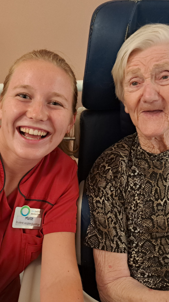 Ik doe al een tijd vakantiewerk in WZC Ter Leenen en werk hier heel graag. Ik begon in de animatie, waar ik een mooie band opbouwde met de bewoners. Na mijn eerste jaar verpleegkunde help ik nu ook mee in de zorg en leer ik elke dag bij.